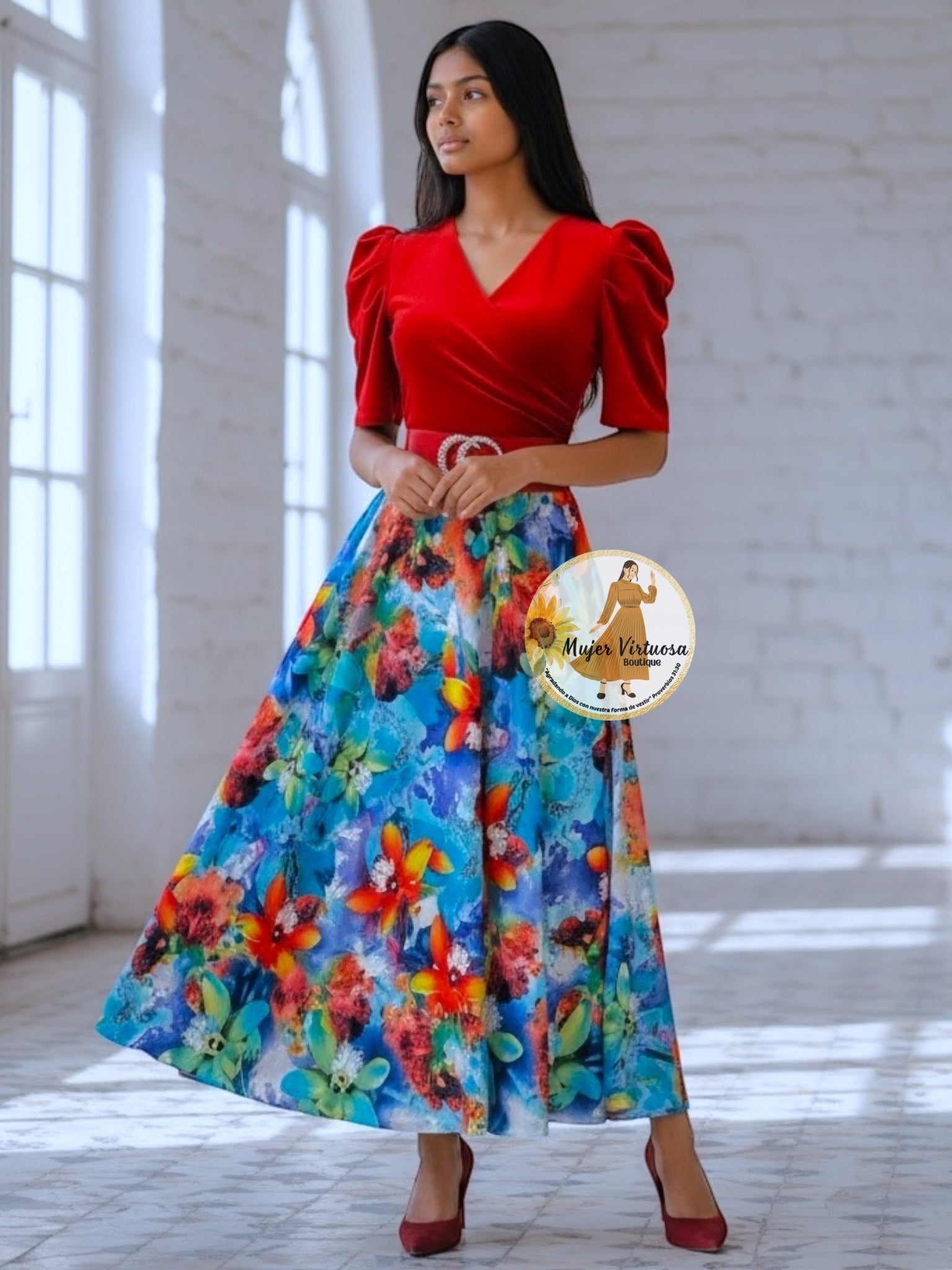 -Se usa tela ligera (fresca) en la parte de la falda & blusa es tela crepé